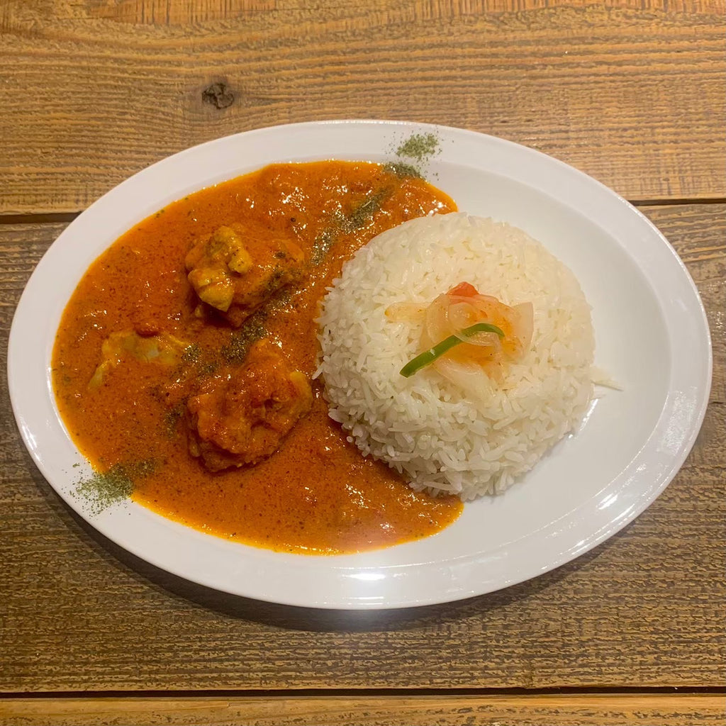 バターのまろやかなコクと、トマトのやさしい酸味と生クリームやヨーグルトのクリーミーさが溶け合った濃厚なソースに、やわらかくジューシーな鶏もも肉がごろっと入った一皿。カルダモンやクローブ、ガラムマサラなど複数のスパイスが絶妙なバランスで香り立ち、辛さは控えめ。口当たりはリッチなのに重くなく、食べ進めるごとにやさしい甘さと奥行きが広がります。バスマティライスやナンとの相性も抜群です。